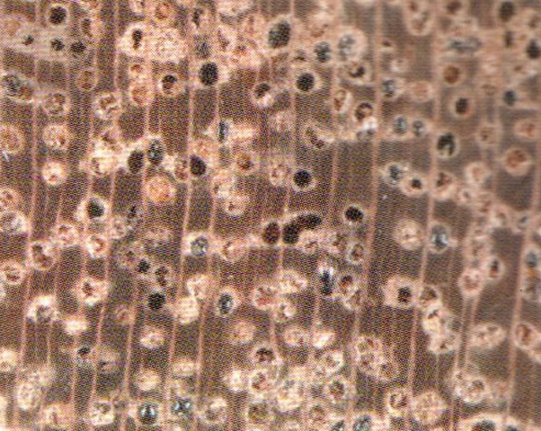 心邊材區(qū)刖路明顯、心材灰紅褐色至紅褐色。久則轉(zhuǎn)為巧克力色。邊材淺灰褐色、寬5~10cm,生長(zhǎng)輪不明顯。