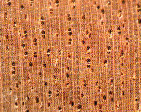 光澤弱;新鮮材具難聞氣味。交錯紋理;結(jié)構(gòu)甚細(xì)、均勻;重量、強度中:干縮大。鋸、刨、旋切等加工容易、切面光滑,但因含硅石.易鈍鋸:油漆、膠黏、釘釘性能良好:抗酸性強。不耐腐。干燥快,略有降等。氣干密度約0.56 g/cm3。
